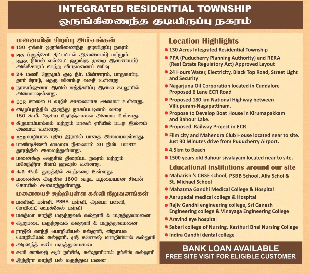 Located at Puducherry – Cuddalore Road, adjacent to Mahatma Gandhi Medical college and Research institute. Excellent ambience and serene atmosphere. Proximity to major medical and Engineering colleges, Hospitals and industrial Hubs.